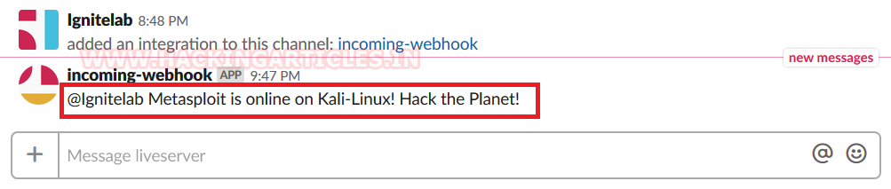 load notify notify_show_options notify_set_webhook <Above webhook URL> notify_set_user @Ignitelab notify_set_source Kali-Linux notify_save notify_test
