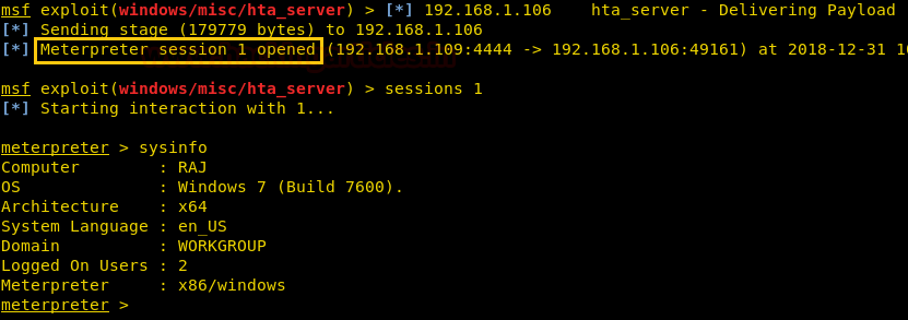 Once you will execute the malicious hta file on the remote machine with the help of mshta.exe, you get the reverse connection at your local machine (Kali Linux).