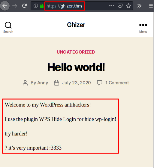 We found a working WordPress on port 443. We a hint for administration panel found, it is protected for WPS Hide Login plugin.