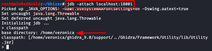 Subsequently, we jdb tool for connecting with we localhost, we executed “classpath” command and we view the base directory of “Veronica” user.