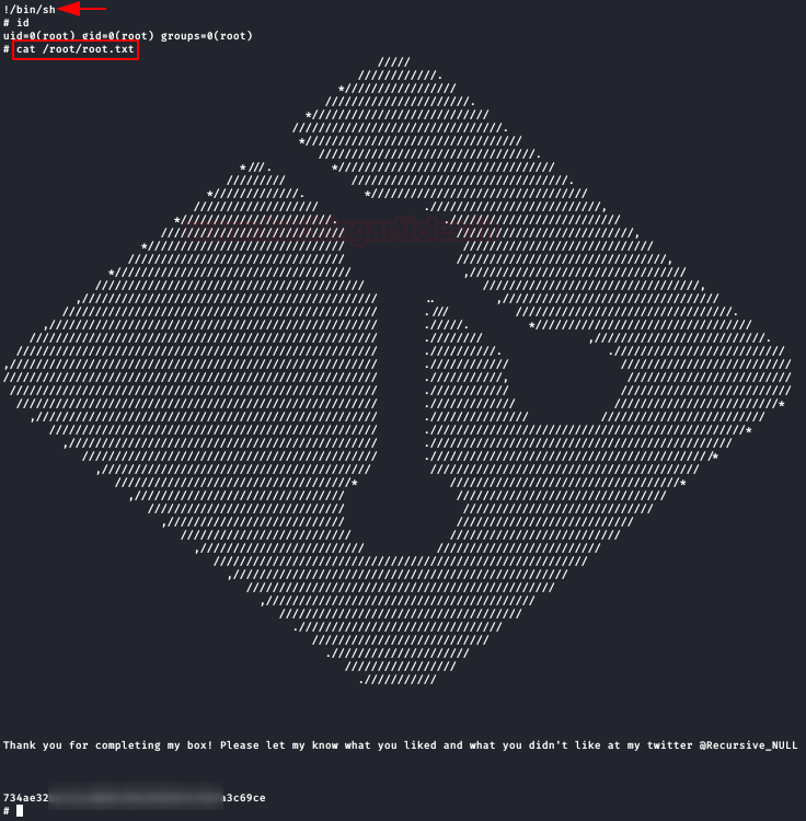 At the bottom, it will allow us to execute commands, type “!/bin/sh“, get the root prompt and read the flag.