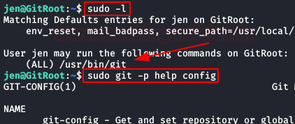 With the user’s password “jen” in our possession, we run the command “sudo -l” and see that we have permissions to the “git” binary, of which there are several methods for escalating privileges over it, we’ll use the command “$ sudo git -p help config”.