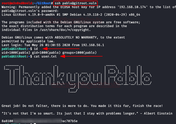 With the credentials obtained, we access through SSH with the user “pablo” and read the flag of user.txt.
