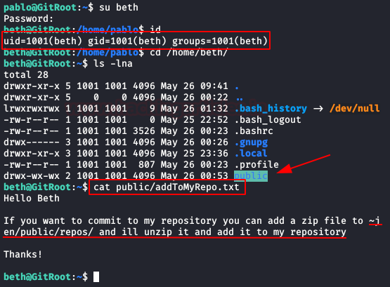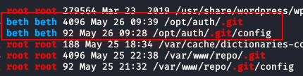 We run “linpeas.sh” and it lists a git repository from user “beth”, so it looks like we found the new repository.