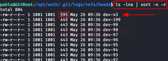 We went into the heads directory of the git logs and found a large list, but if we sort them by size we’ll see that there’s one that’s larger than the rest.