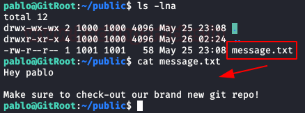 We keep listing the contents of “Pablo” folder, we find a folder called “public“, inside it, we have a message inviting us to check out a new git repository.