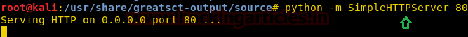Now, firstly, start the python’s server in /usr/share/greatsct-output/source by typing: