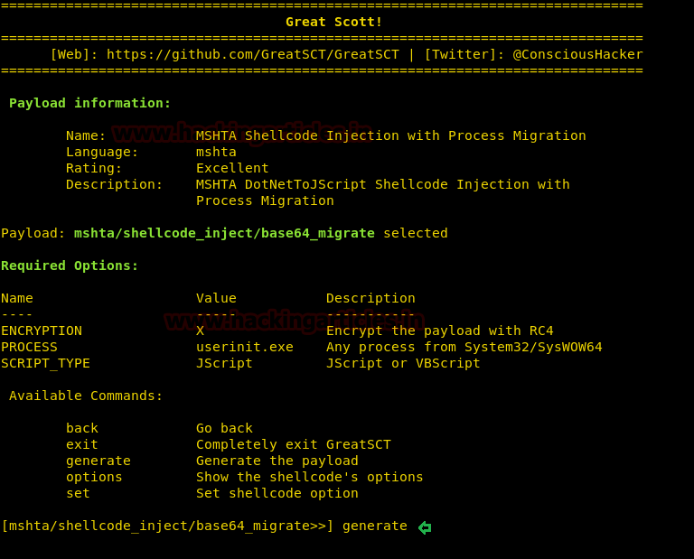 GreatSCT is current under support by @ConsciousHacker, the project is called Great SCT (Great Scott). Great SCT is an open source project to generate application whitelist bypasses. This tool is intended for BOTH red and blue team. It is a tool designed to generate Metasploit payloads that bypass common anti-virus solutions and application whitelisting solutions.