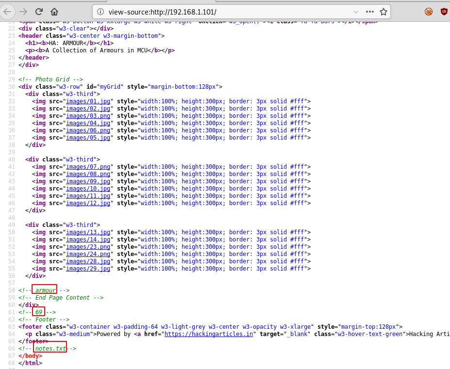 Ahh!! So, as you can see from the image given below that from inside the source code we found 3 things i.e. “armour, 69 and notes.txt” from inside the comment.