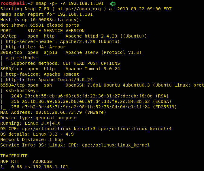 With the help of scanning, you can find that port numbers 80, 8009, 8080 for HTTP (apache http, apache Jserv & apache tomcat) & 65534 for SSH are opened.