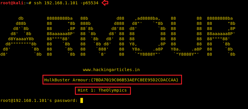 You will find the first “HulkBuster” armour when connecting to SSH via port 65534 and the first hint: the Olympics as mentioned above for Klaw.