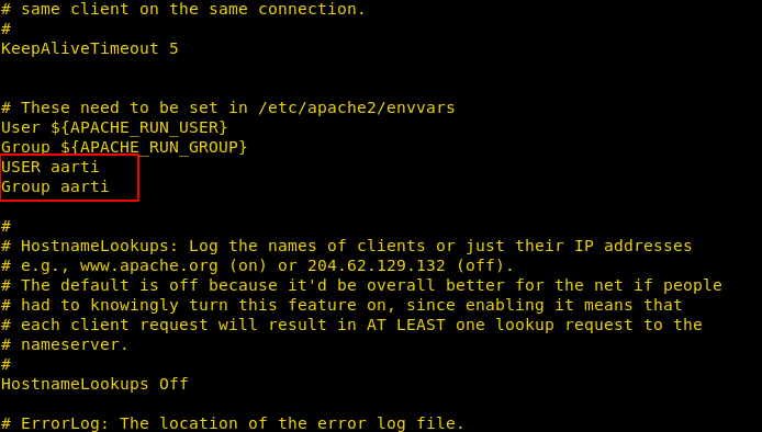 This machine has a user profile named as “aarti” that we had enumerated through /etc/passwd and now try to add a user:aarti and group:aarti inside the /etc/apache2/apache2.conf so that we will leverage it for privilege escalation. So, the idea is when we restart the apache service it will get executed with aarti user privileges.
