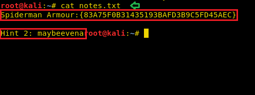 From inside notes.txt file, you will get the second amour which is for “Spiderman” and 2nd Hint:maybeevena which was hidden by Klaw.