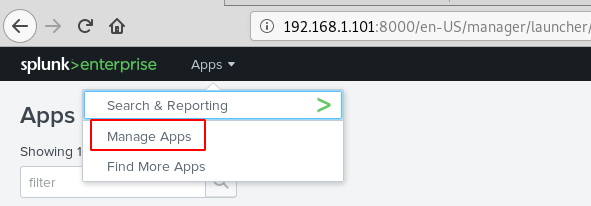 The .gz file from the link was saved on our system, we navigate to the “App: Search & Reporting” option and click on “Manage Apps”.