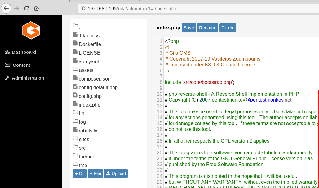We see that we have the list of all the files hosted via the Gila CMS. We see that we have the index.php file. It seemed like our way in. So, we opened the file. It contained the PHP code for the display of the index page. We used our PHP reverse shellcode by pentestmonkey. It can be found here. We changed the IP Address in the shell to the IP Address of our Attacker Machine. We started a netcat listener on our attacker machine on the port that we mentioned in our reverse shell. After making the necessary changes, we saved the changes in index.php. And we opened the file in the Web Browser.
