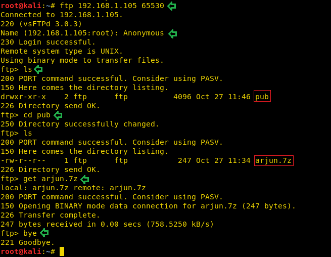 ftp 192.168.1.105 65530 Anonymous ls cd pub ls get arjun.7z bye