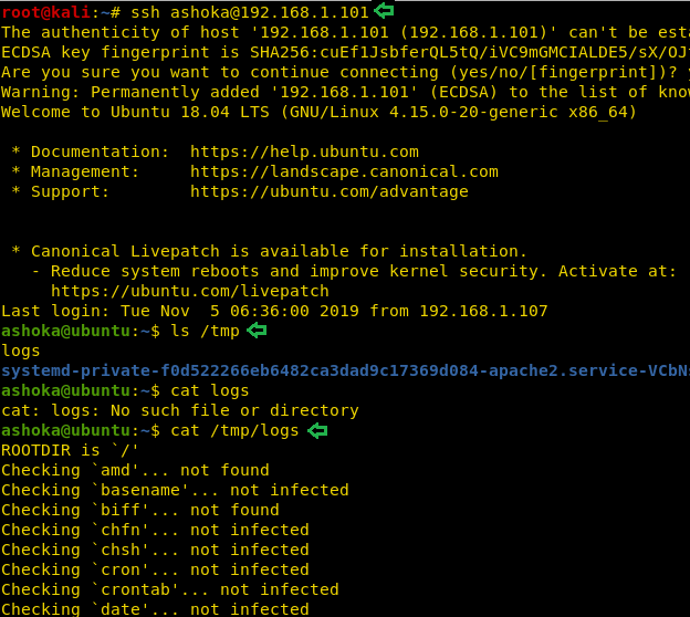 Now we will be connecting to the target machine using the ssh. It will be possible to login now due to the authorized keys we placed earlier. We got a shell of the Ashoka user. After some enumeration, we see that we have a logs file inside the temp file. We tried to take a look at it using the cat command. It definitely looks like a Chkrootkit test results log. This is clue that we might be able to escalate privileges on this machine using Chkrootkit.