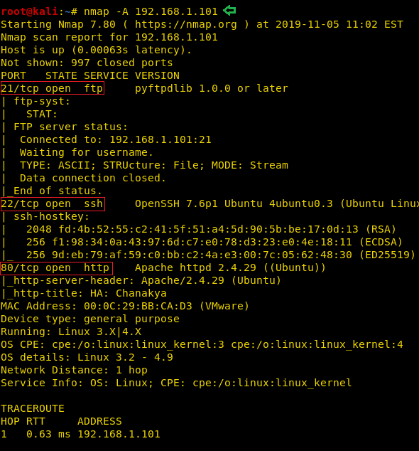 Now that we have the Target Machine IP Address, our next logical step would be to do a port scan on the target to get information about the various services that are running on the target machine. After the Aggressive Scan of all the ports, we see that we have the SSH service (22), HTTP service (80), FTP service (21) running on the Target Machine.