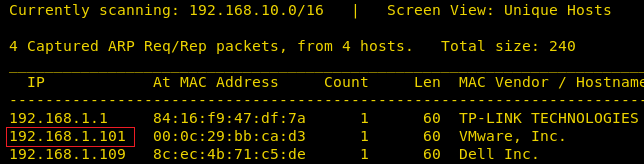 After downloading, run the Machine in VMWare Workstation. To work on the machine, we will be needing its IP Address. For this, we will be using the netdiscover command. After matching the MAC and IP Address we found the Virtual Machine IP Address to be 192.168.1.101.