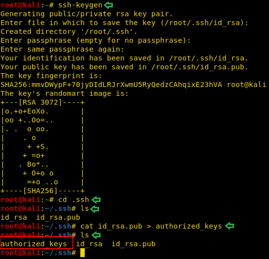 ssh-keygen cd .ssh ls cat id_rsa.pub > authorized_keys ls