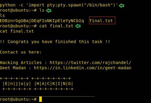 python -c 'import pty;pty.spawn("/bin/bash")' ls cat final.txt