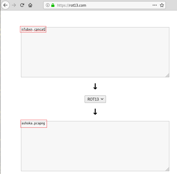 After searching on the Internet for a while we found that ROT13 resembles to the text we found. So, we decided to decode the text using the ROT13 Decrypter found here. When we decrypted the encoded text to be the name of a packet capture file. Let’s find this file.