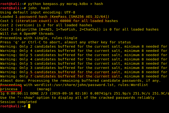 As we didn’t know the ‘master password’, we decided to run a python script which created the key hash and then with the additional help of john the ripper we cracked the password and to do so, type :