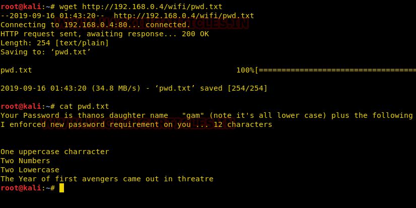 Once downloaded, we read the pwd.txt file using the cat command. And it said