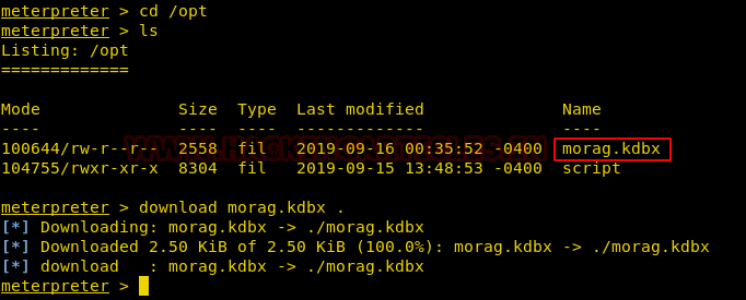 The above commands allowed us to see the contents of /opt and there we found morag.kdbx. now this morag.kdbx is important for two reasons i.e. there was a planet named Morag in avengers series and .kdbx tells us that it might have password key database.