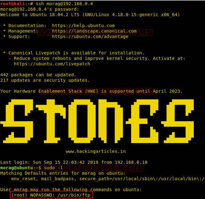 After logging in through SSH, we used ‘sudo -l’ command to see which user had no password and the result was : /usr/bin/ftp. So we switched the user to ftp and further accessed root to find our final flag by using the following set of commands :