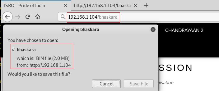So, we went on to our browser in order to browse the bhaskara directory. We see that a file is downloaded when we browse the URL. This is a 2MB file. After enumerating the file, we came to realize that it is a TrueCrypt file.