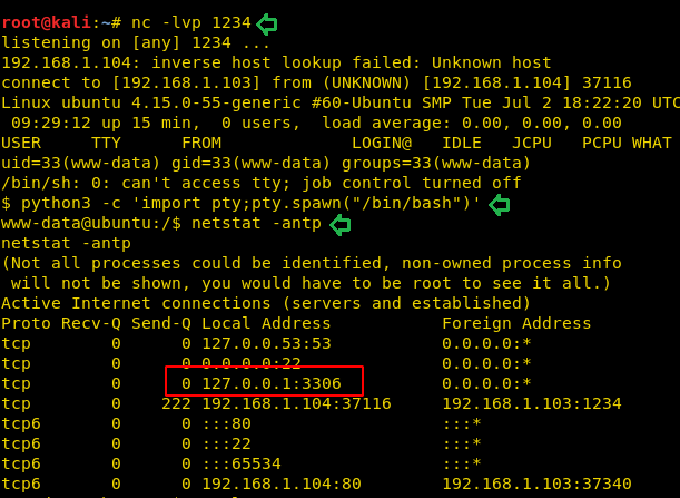 We used netstat command to check for the IP address and ports the target machine is listening on and found that a web service (3306) is allowed for localhost only. The most common service to run on the port 3306 is MySQL. Let’s enumerate in that direction.