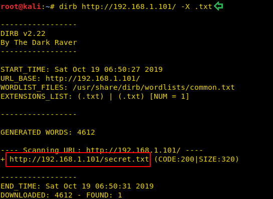 Now while we were busy browsing the webpages, we also started a directory bruteforce scan using the dirb tool. We applied different variants of scans with different extensions. We got success with the .txt extension. We found the secret.txt.