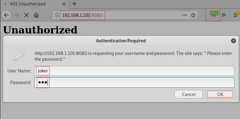 Now as this is a web application and we are required to perform a brute force, we are going to use the BurpSuite Application. For that, we are going to open the webpage hosted on the port 8080 and enter any random characters in the login panel and press the OK button after applying the burp proxy.