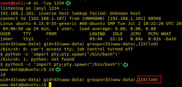 After we got the shell, we saw that the shell that we got is an improper shell, so we used the python one-liner to convert it into a proper shell. After conversion, we ran the id command. We saw that this shell is of the user ‘www-data’. We saw that this user is a part of the lxd group. This could be our way to root.