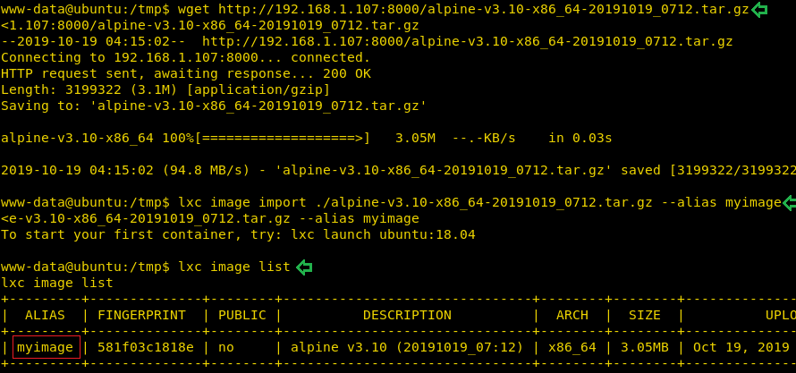 wget http://192.168.1.107:8000/alpine-v3.10-x86_64-20191019_0712.tar.gz lxc image import ./alpine-v3.10-x86_64-20191019_0712.tar.gz --alias myimage lxc image list