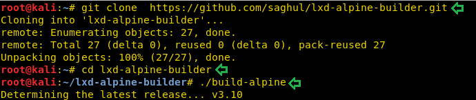 In order to take escalate the root privilege of the target machine, we will have to create an image for lxd. To that, we will first, Download build-alpine in the attacker machine (Kali Linux) through the git repository. After that, we will be traversing it into the lxd-alpine-builder directory and execute the script “build -alpine” that will build the latest Alpine image as a compressed file.