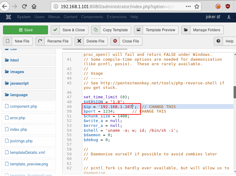 Now that we have logged in on the Joomla as the SuperUser. To exploit the Joomla server, we will use the PHP reverse shell. They can be found in Kali Linux. We will move on to the Template Section. To do so, we will first click on the Extensions Option on the Menu. Then, traverse in the beez3 template and choose Customise. This is open an edit section as shown in the image. Now, select the index.php and replace the text inside the index.php with our reverse shell. Remember to change the IP Address and/or change the port.