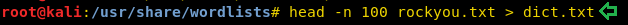 Now that we have formulated a plan to use the top 100 passwords from the rockyou.txt dictionary, it’s time to compile a smaller dictionary of those 100 passwords so as to make the bruteforce faster and lighter. To do this we are going to use the head command. From the head command, we are going to pass the parameter of 100 keywords and direct the output generated by this command in a text file using the greater than (>) symbol.
