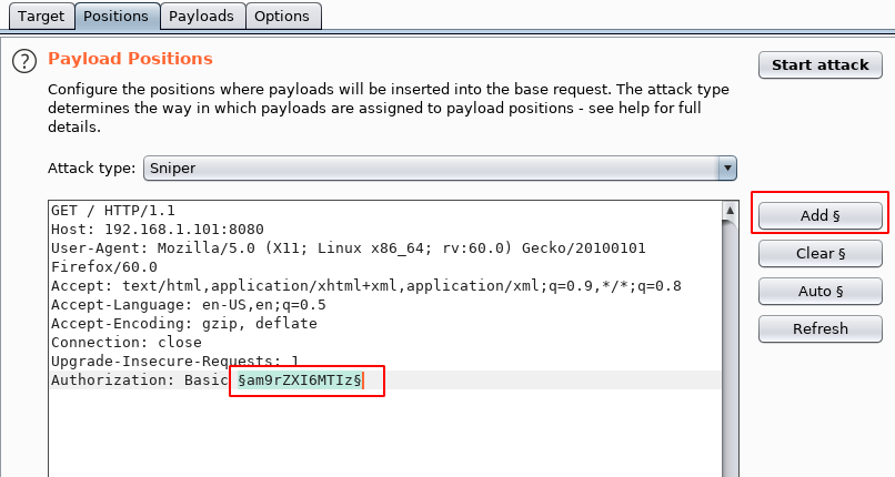 After Sending it to Intruder, we are going to check the Intruder tab for the transferred request. Here in the Intruder section, we are going to get into the Positions Tab. Here we select the Attack type to be Sniper. We will select the Authorization hash and Click on the Add Button on the right side.