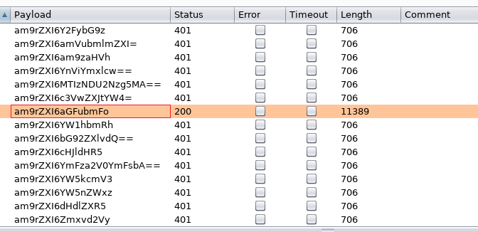 The base64 encoded value of Authentication is a combination of username and password now the scenario is to generate the same encoded value of authentication with the help of user password dictionary, Therefore, I have made a dictionary which contains both user password names in a text file.